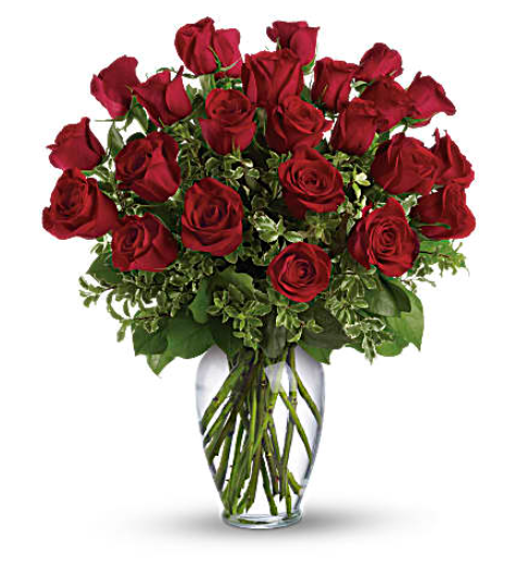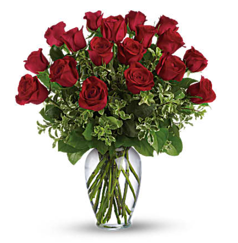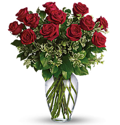 The classic romance of a dozen red roses can say so many things, from "I love you!" to "I'm sorry." Stunning in its simplicity, this elegant arrangement of deep red roses, rich green salal and delicate pitta negra makes quite an impression. It's the perfect choice when you want to send flowers to your girlfriend's office!