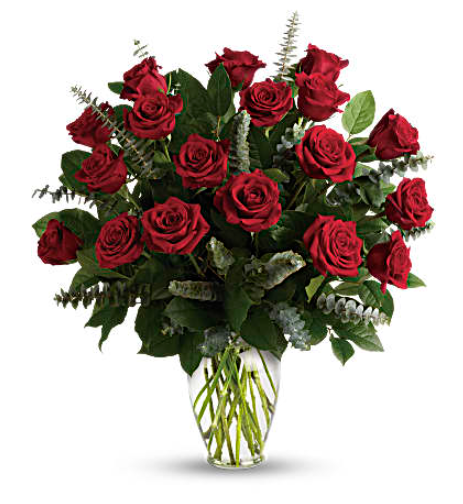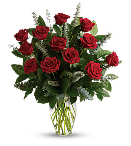 Proclaim your eternal love with this breathtaking bouquet! One dozen resplendent red roses, gathered with alluring greens in a classic glass vase, is a romantic gift she won't soon forget.
