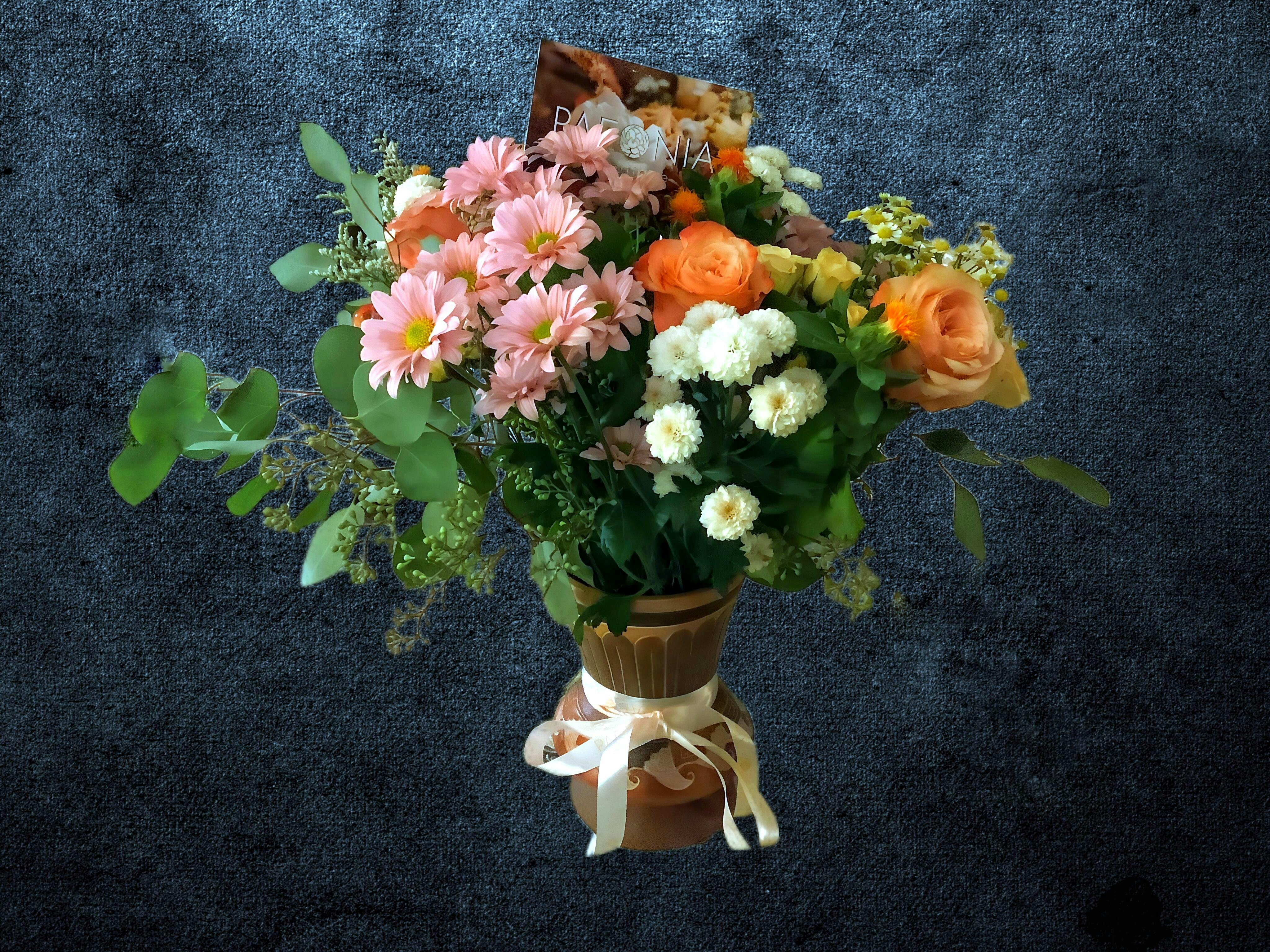 Bouquet features dahlias, roses, carnations, greenery, mums, eucalyptus.