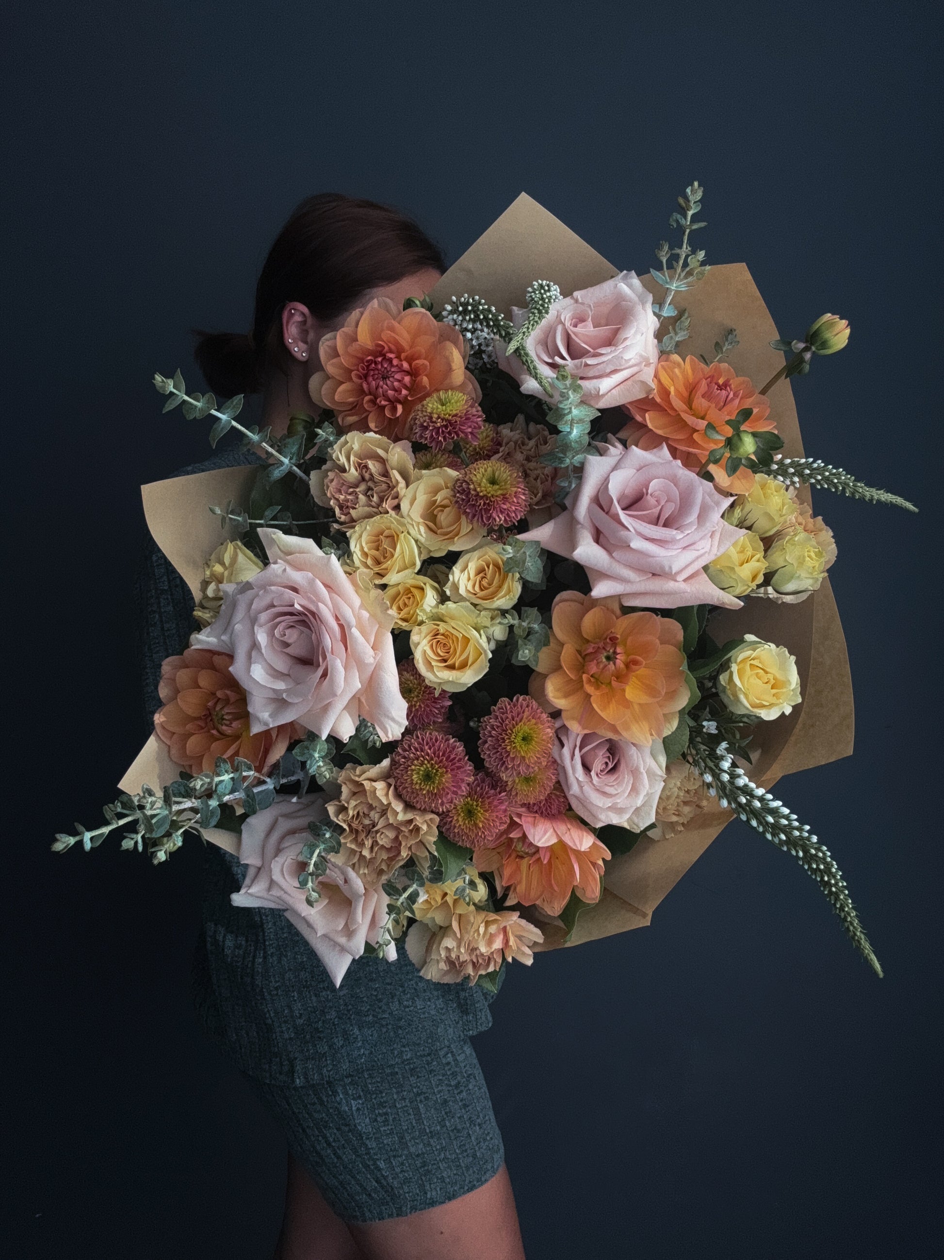 Bouquet features dahlias, roses, spray roses, greenery, carnations, eucalyptus.