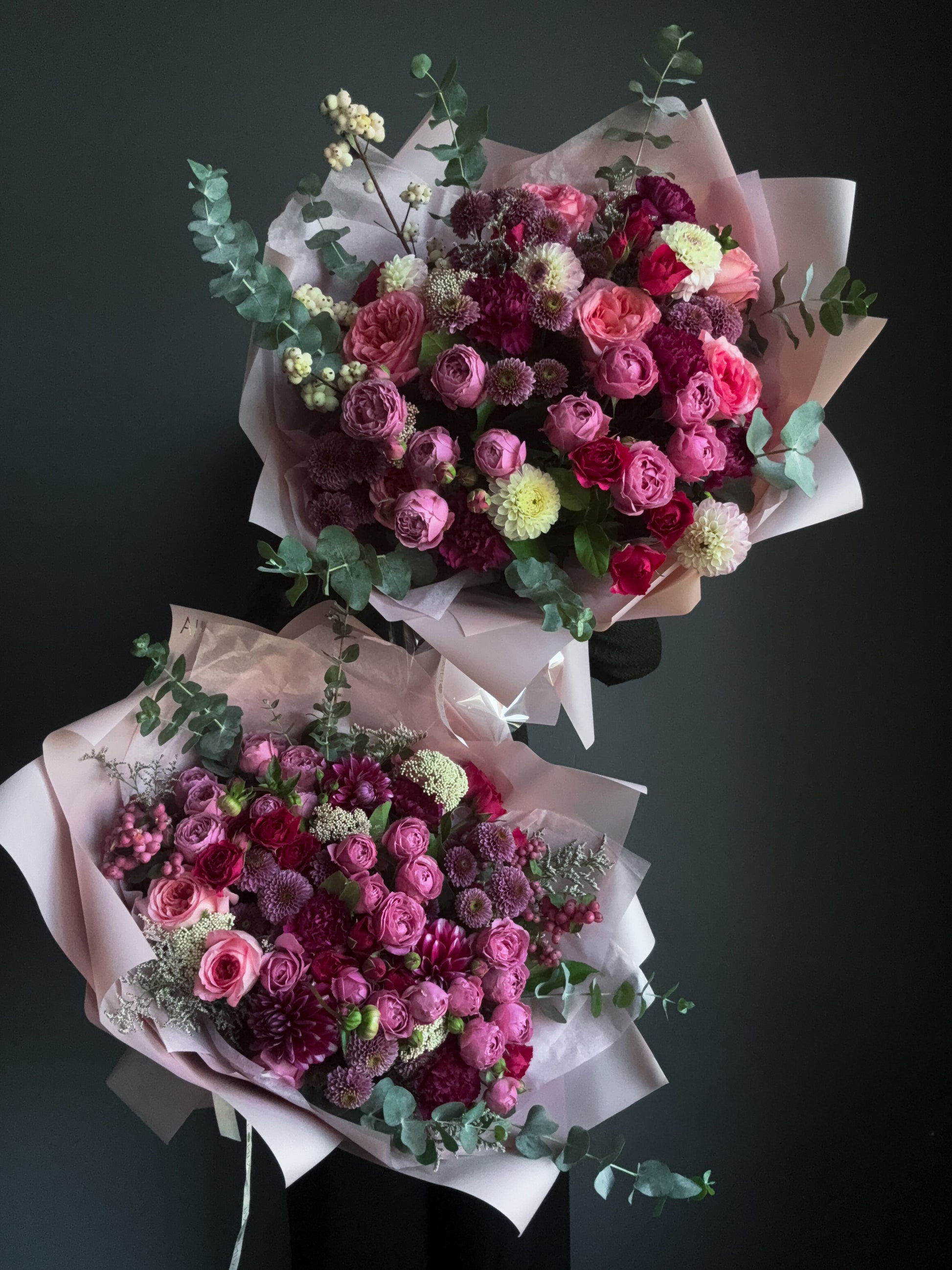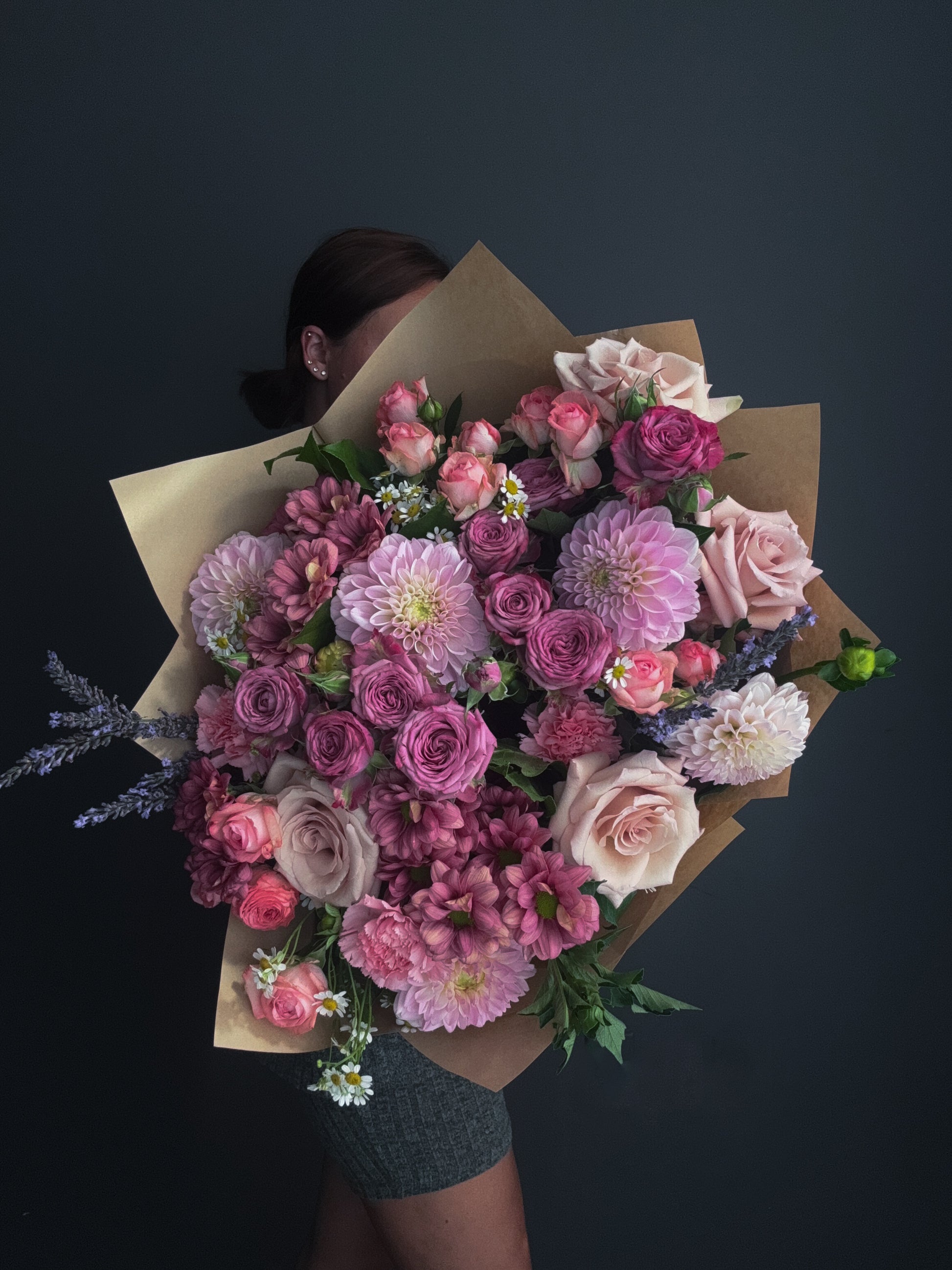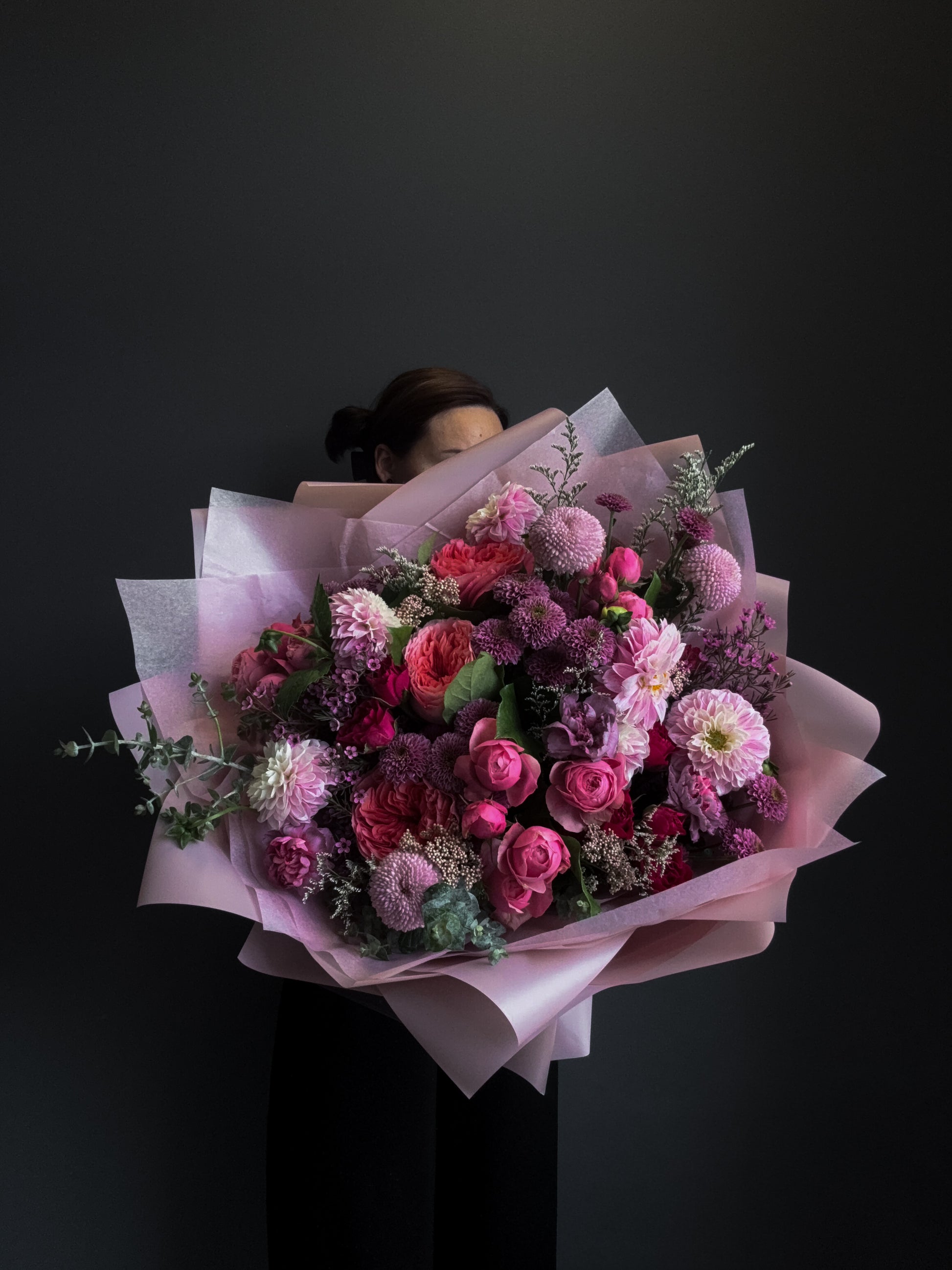 Bouquet features dahlias, roses, spray roses, carnations, greenery, eucalyptus.