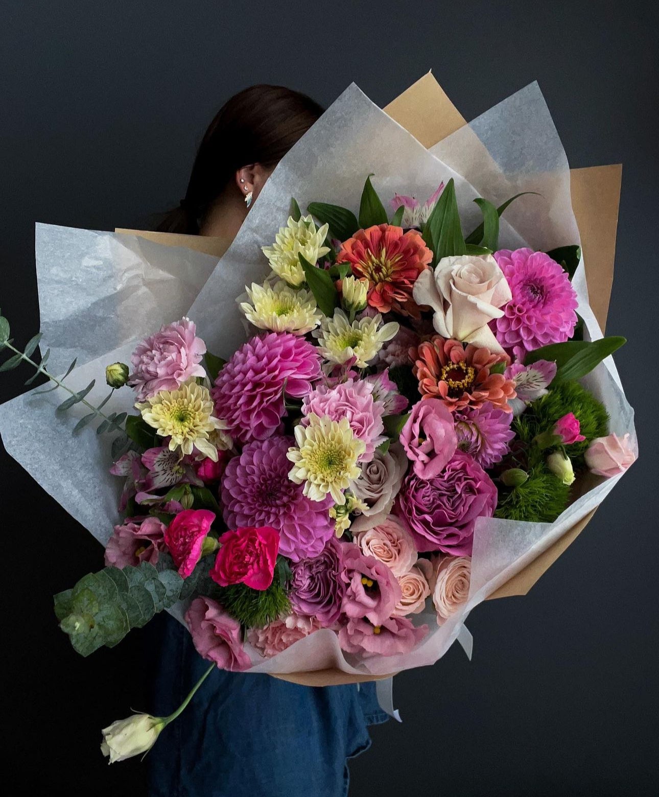 Bouquet features dahlias, roses, carnations, greenery, zinia, eucalyptus.
