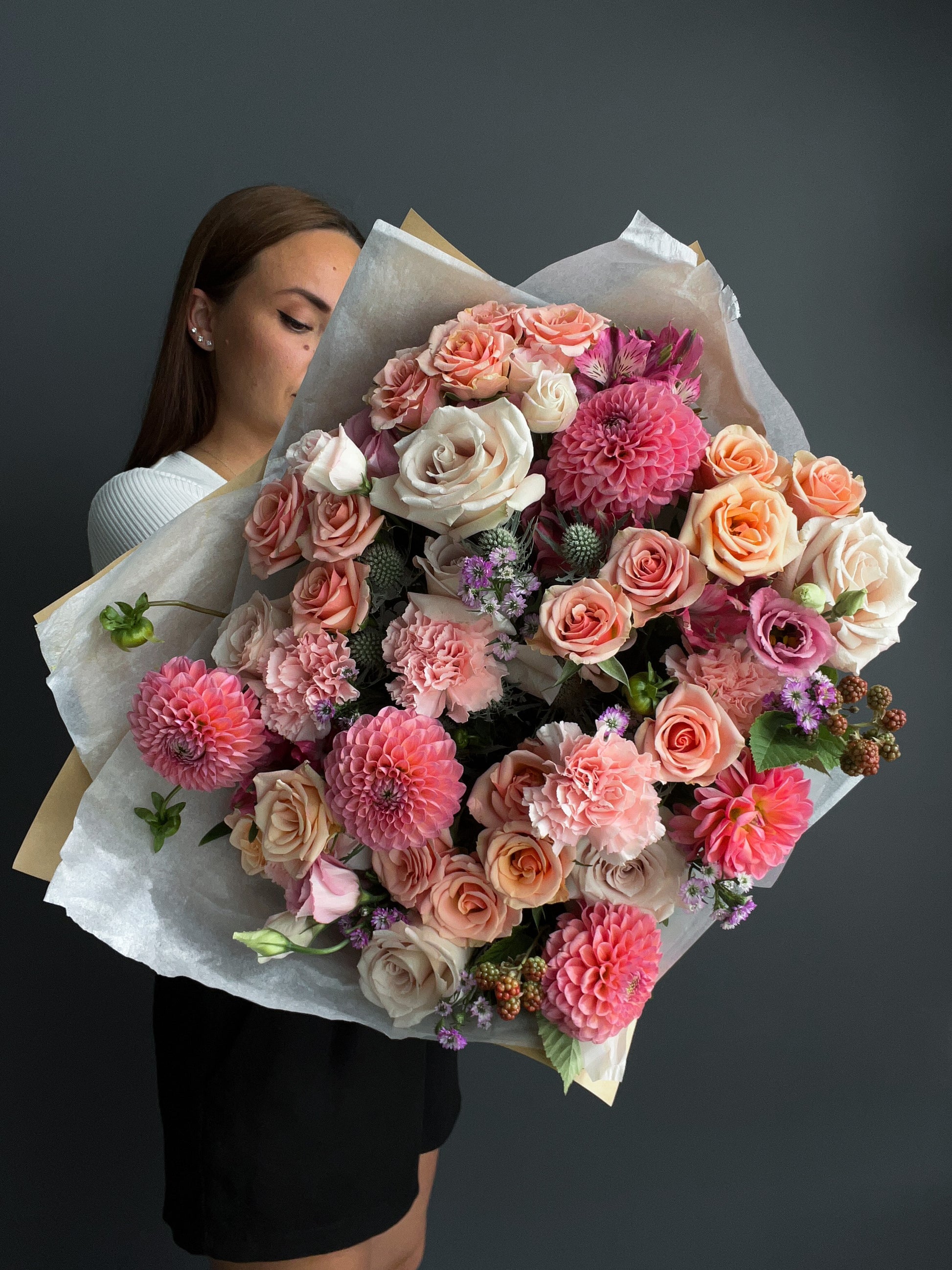 Bouquet features dahlias, carnations, spray roses, alstroemeria,peony roses, etc