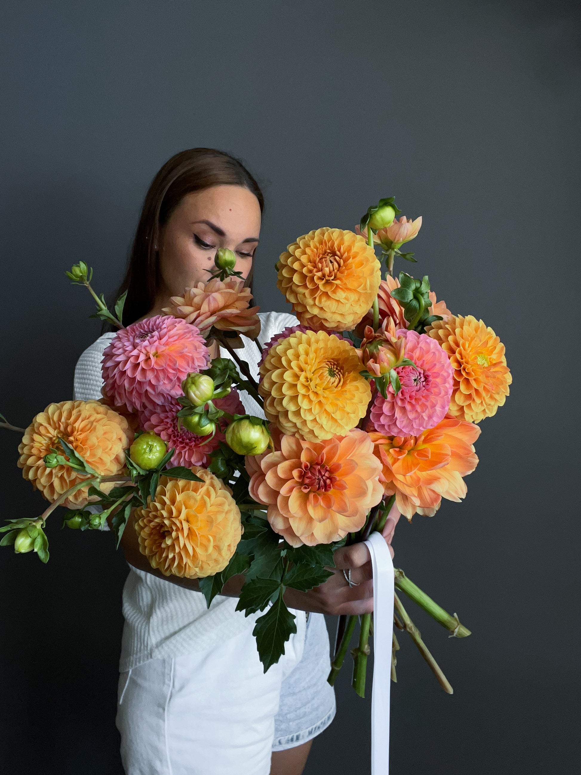 Bouquet features dahlias.