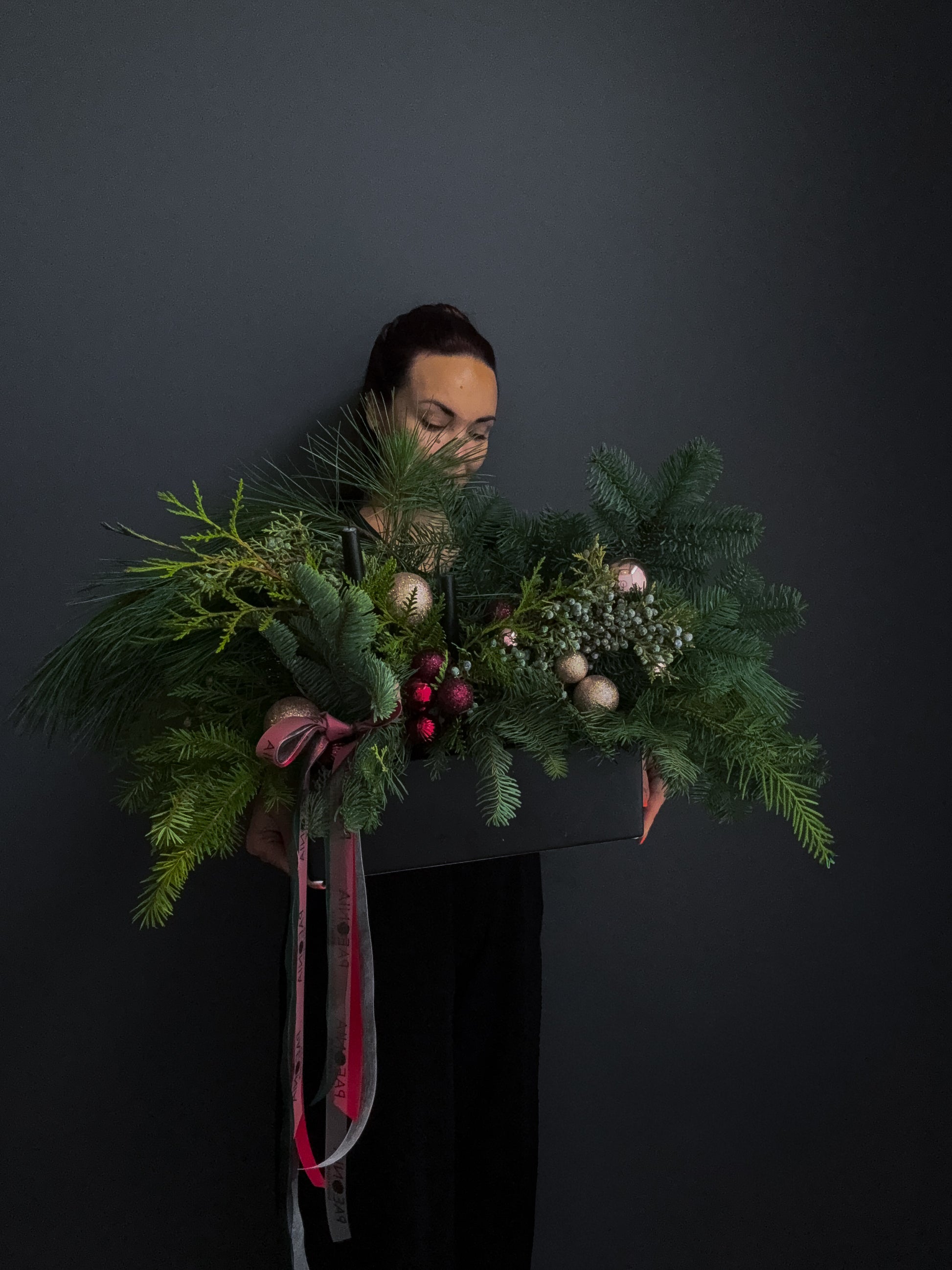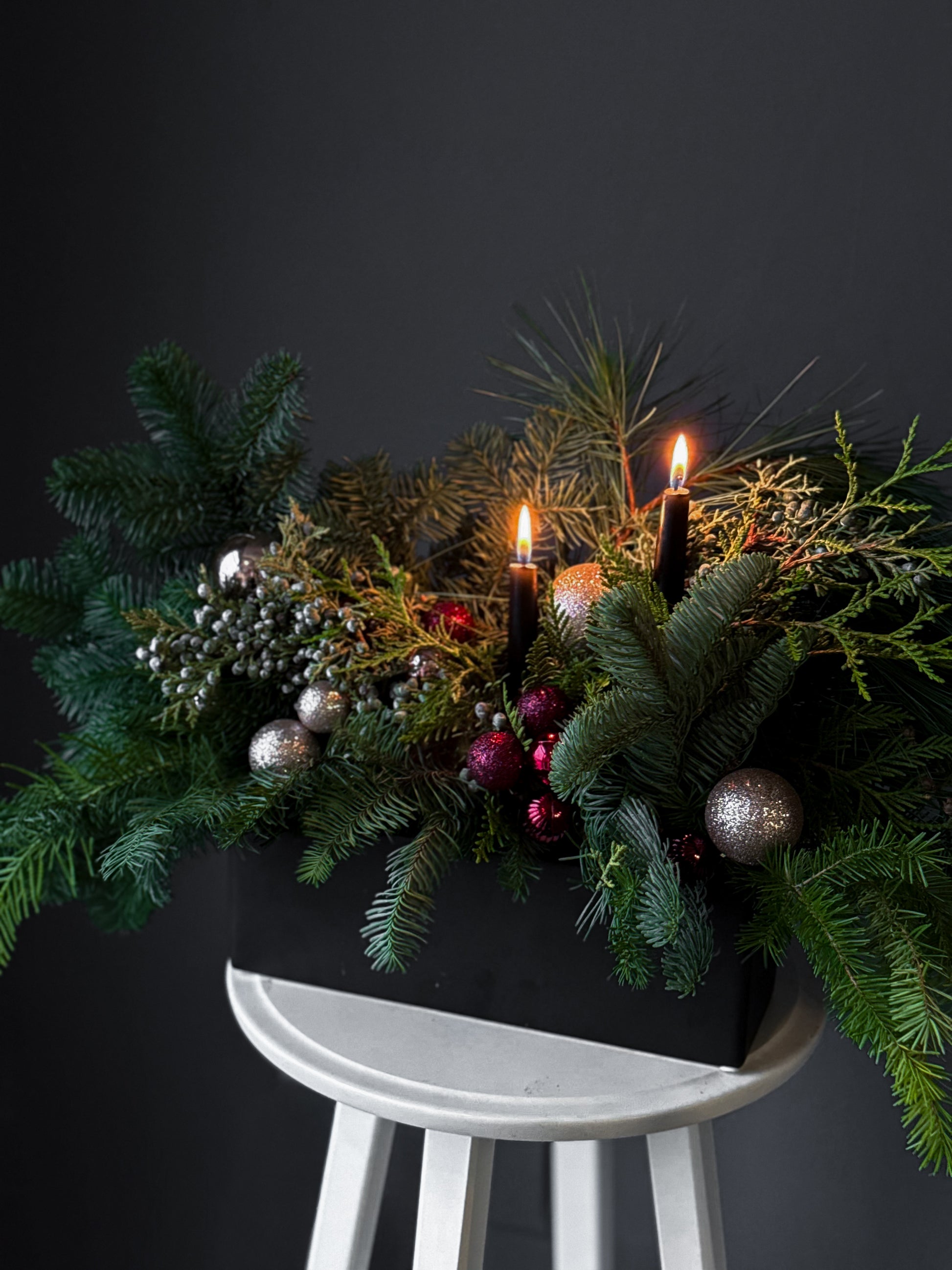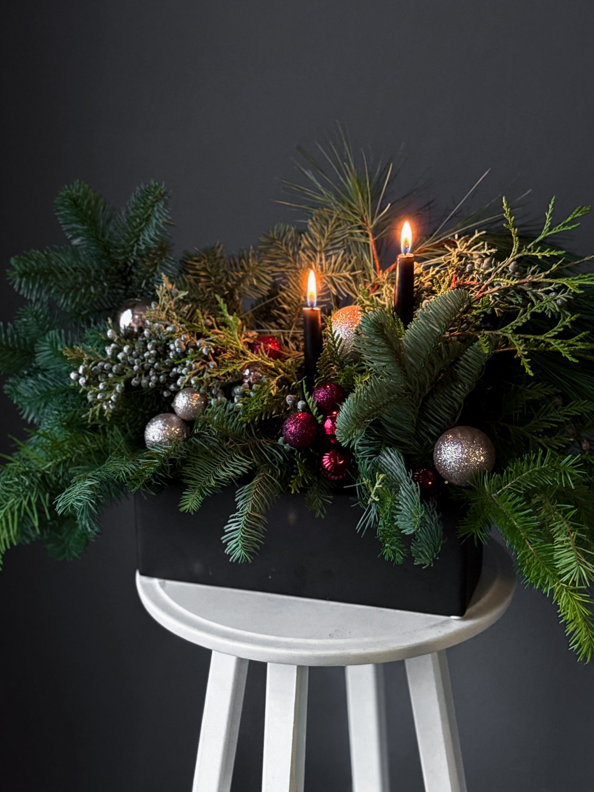 A modern holiday centerpiece with a dramatic, moody twist. This rectangular arrangement is built from fresh winter greens — noble fir, pine, and cedar — and accented with deep red berries, silver ornaments, and two matte black taper candles. Designed in a sleek black box, it's the perfect statement for festive tables or stylish interiors.