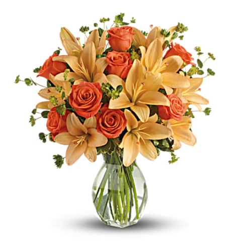 Ignite their heart with this inspirational gift of warm orange roses and lilies. As wondrous as a summer sunset - but quite a bit more fragrant! - it's a versatile choice for men and women alike.