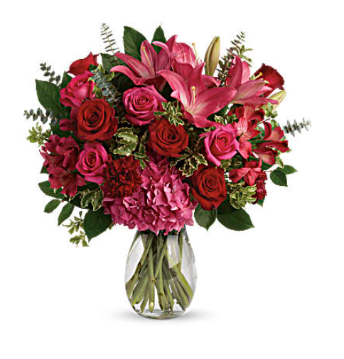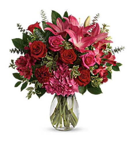 There's no denying it, you're love struck! Shout it from the rooftops with this dramatic bouquet of hot pink hydrangea, roses and lilies.