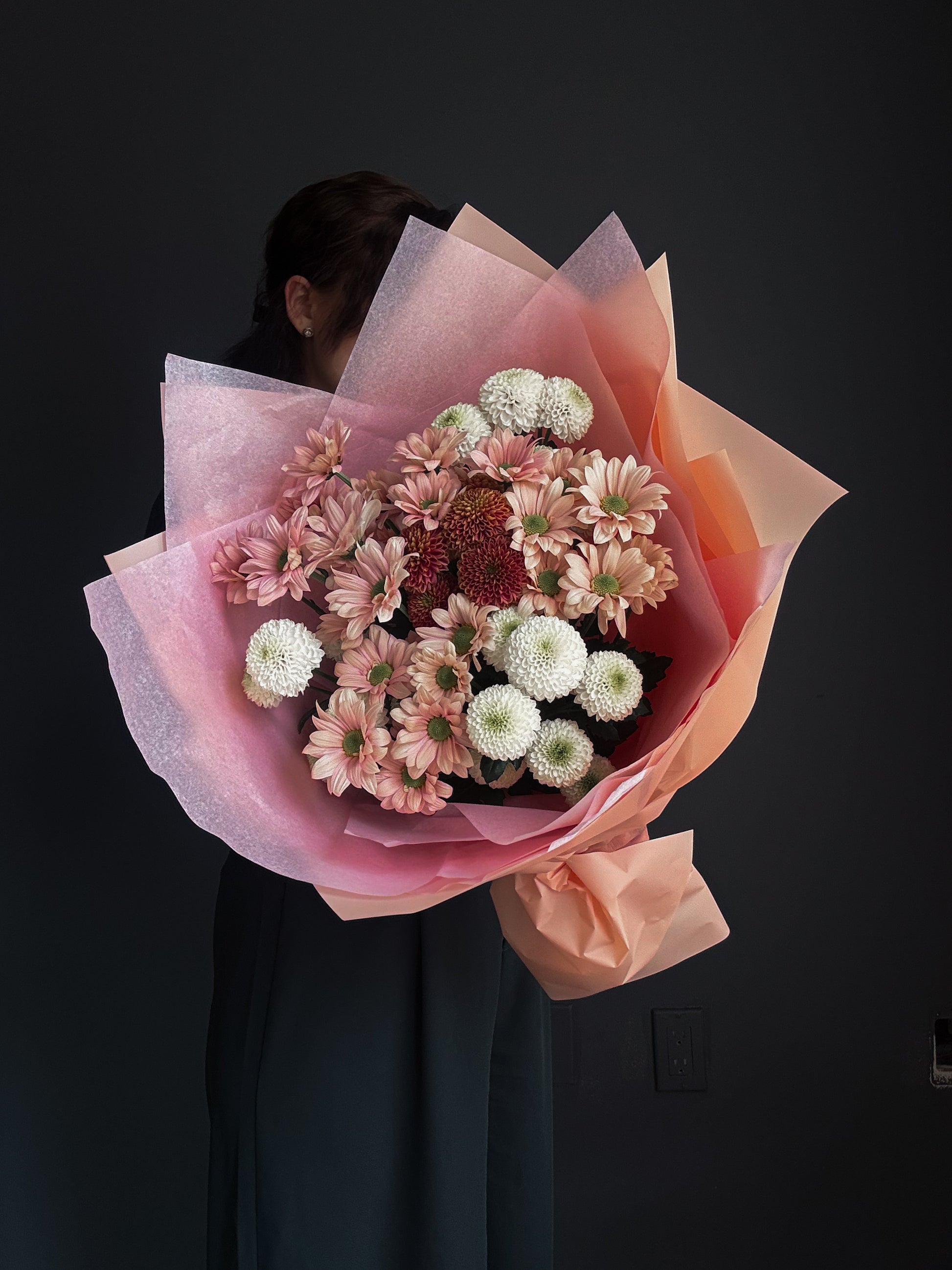 Each bouquet is designed with fresh flowers sourced daily — roses, spray roses, limonium, chrysanthemums, and other seasonal favorites. The exact mix may vary slightly depending on availability, but the look and color palette always stay true to the photo.