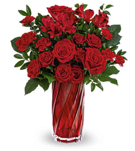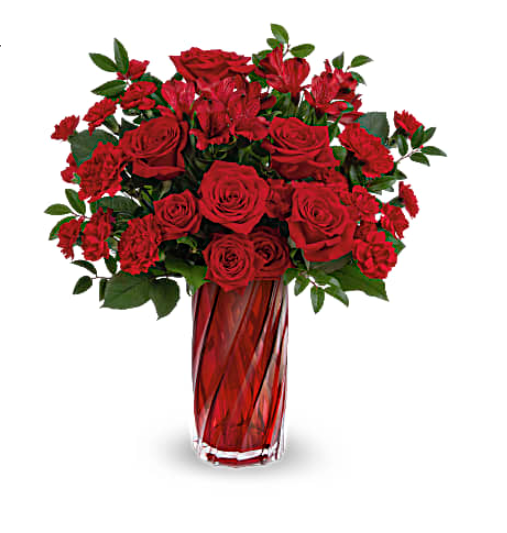 This arrangement includes red roses, red spray roses, red alstroemeria, red carnations, miniature red carnations, lemon leaf and huckleberry. Teleflora's Meant For You Bouquet is delivered in Teleflora's Swirling Splendor Vase.