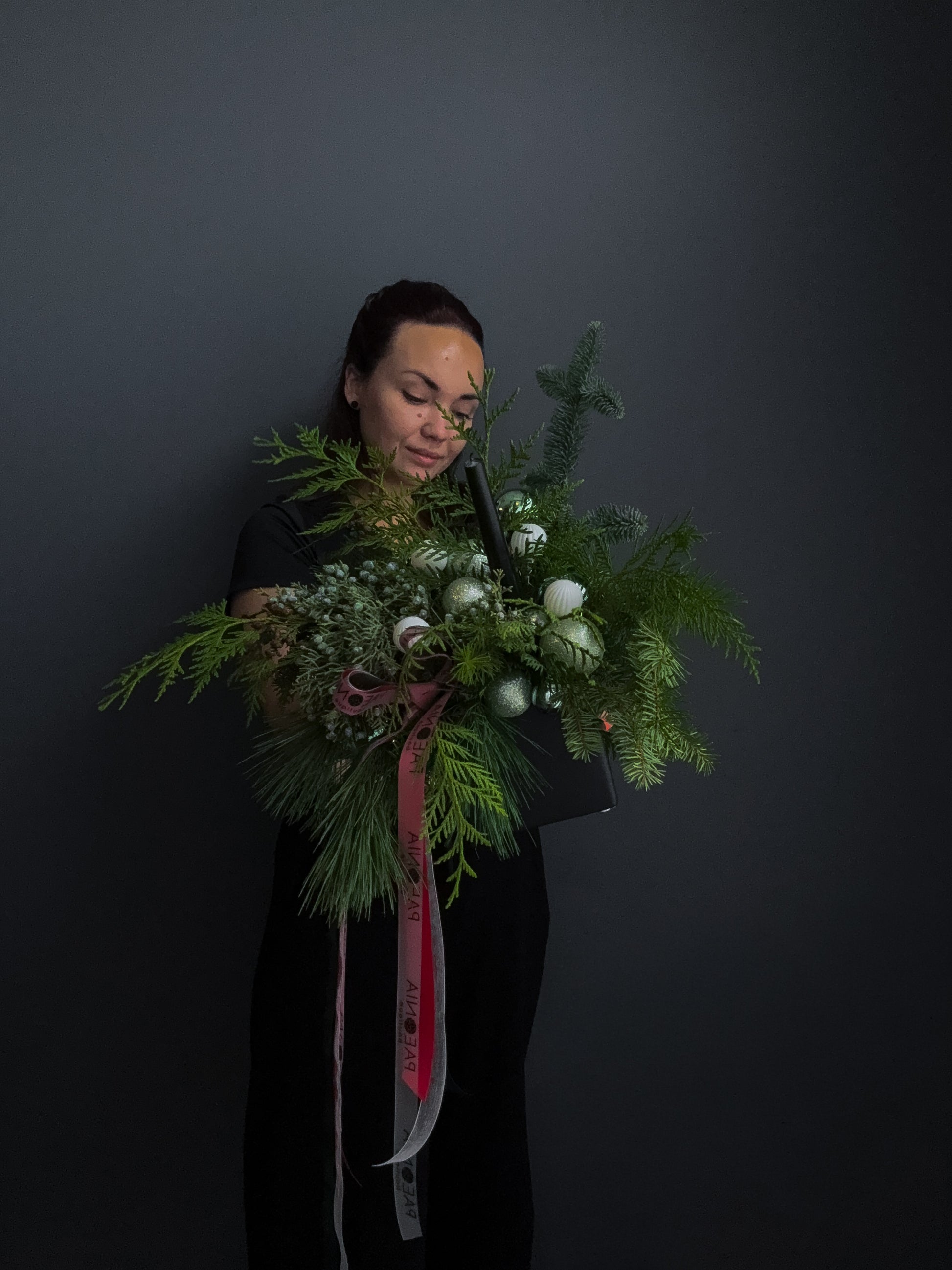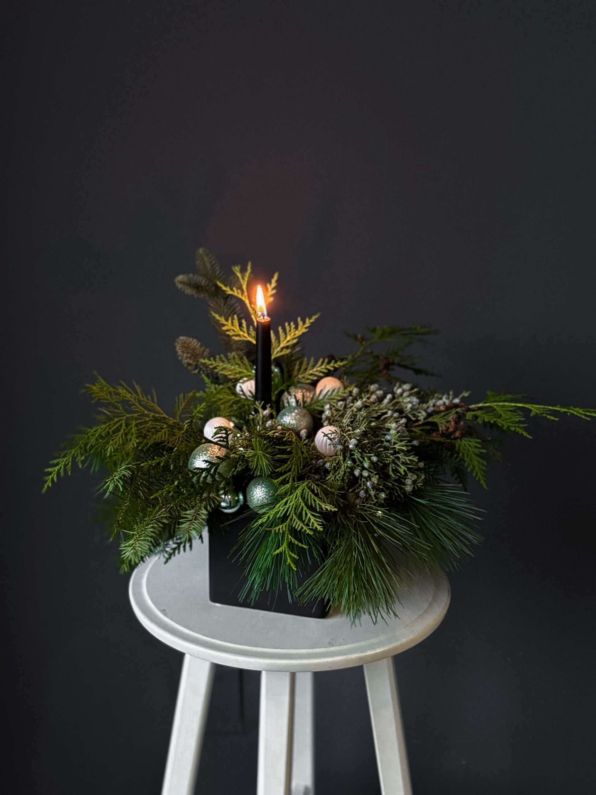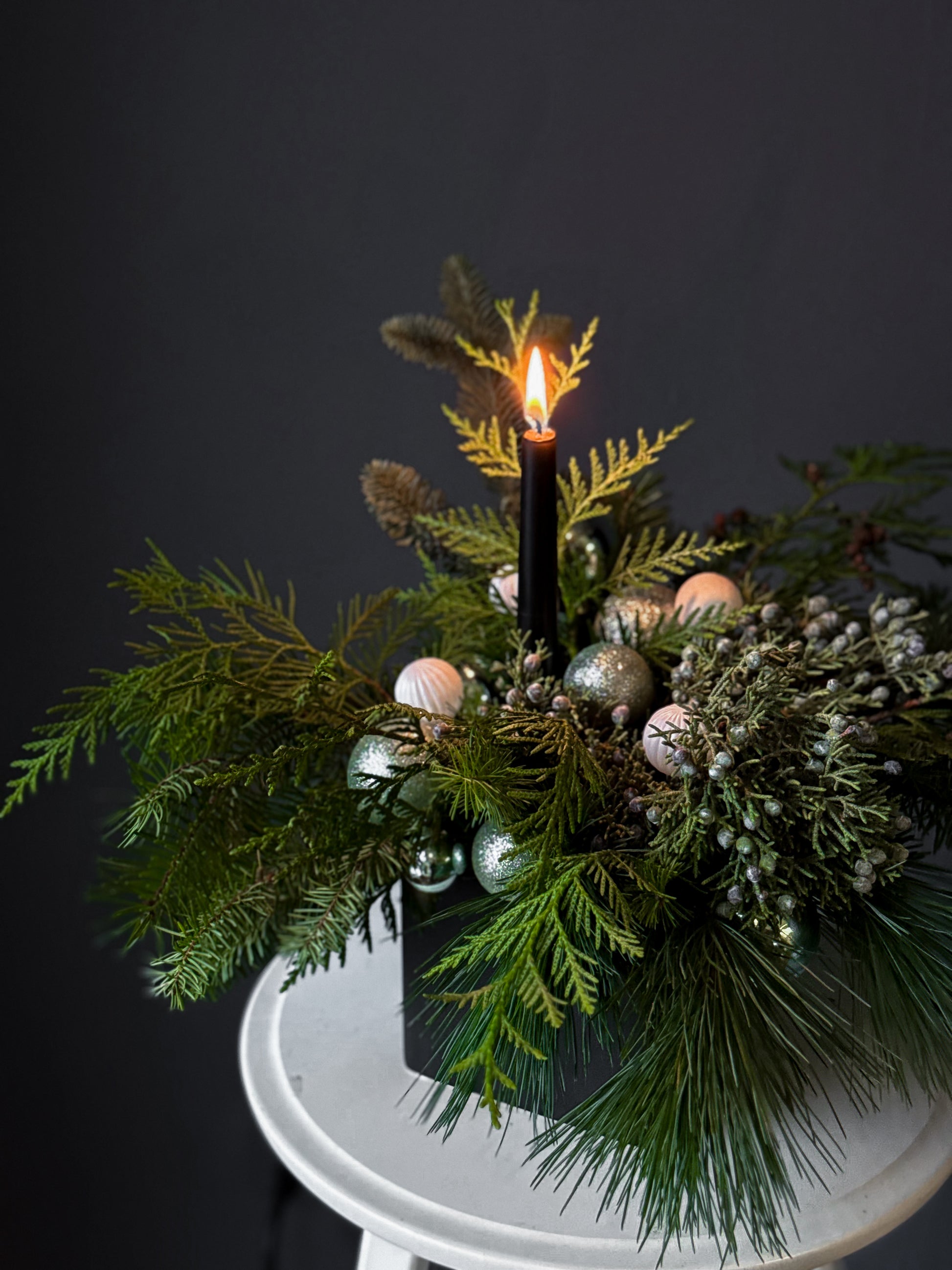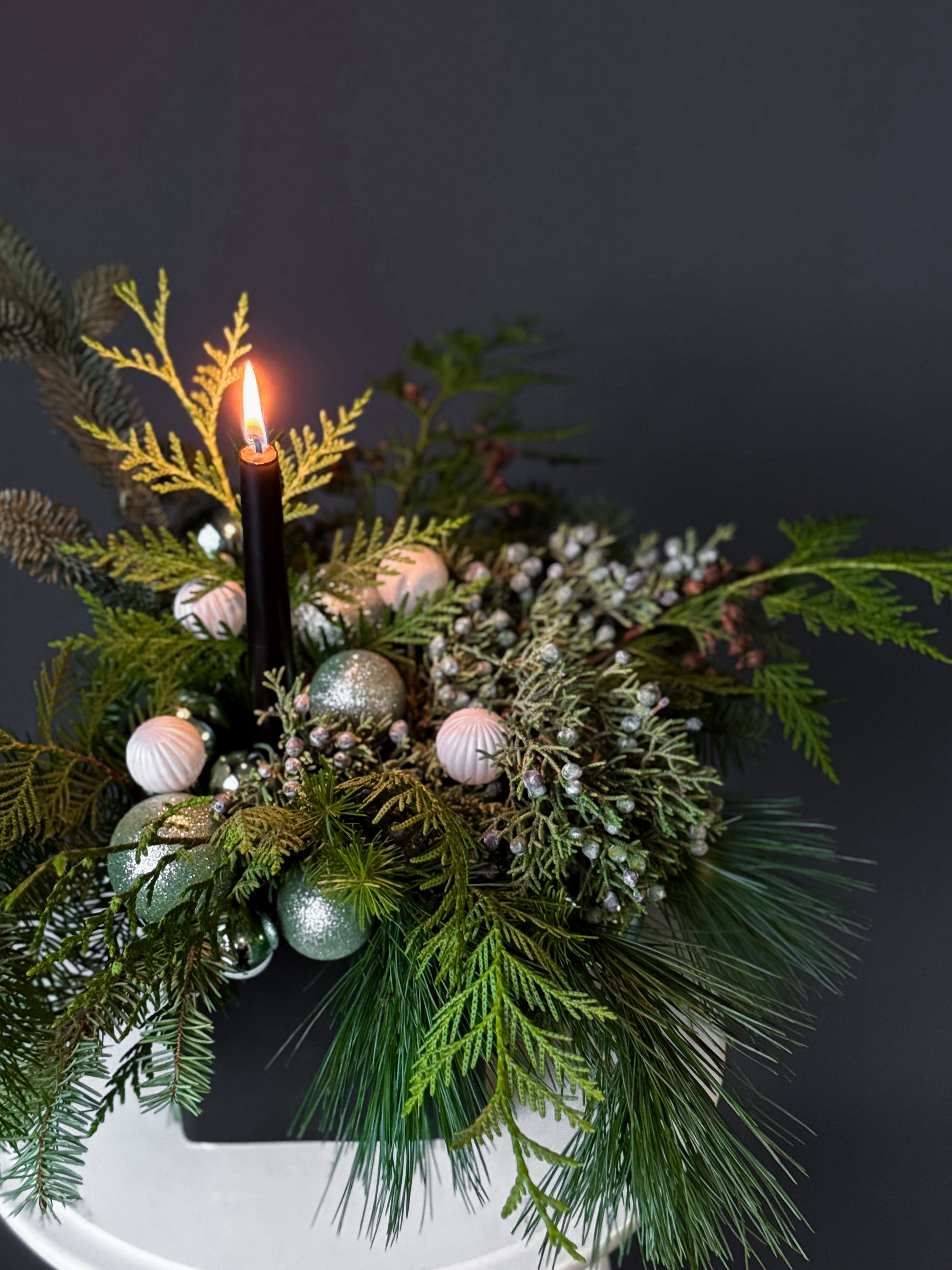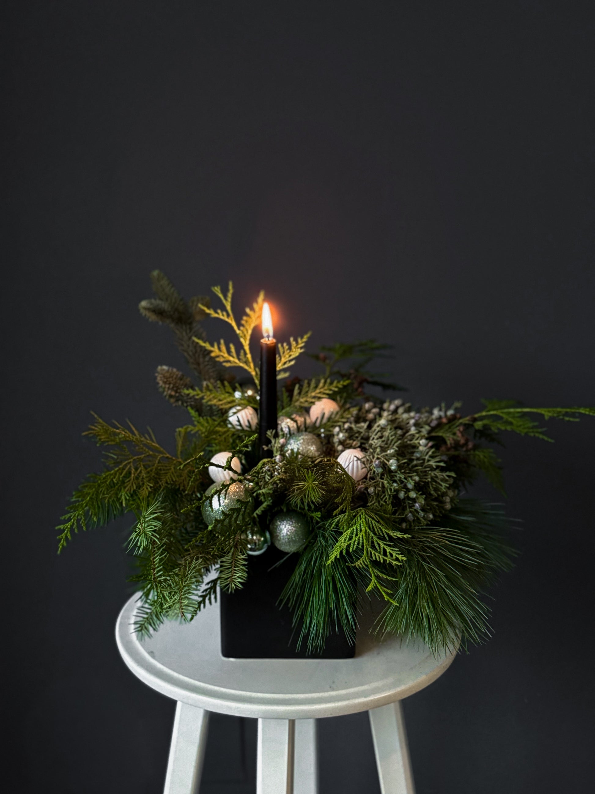 A cozy and modern tabletop arrangement, perfect for smaller spaces or thoughtful gifting. Fresh pine, cedar, and fir are accented with icy white and silver ornaments, frosted berries, and a single black taper candle for a moody holiday touch.