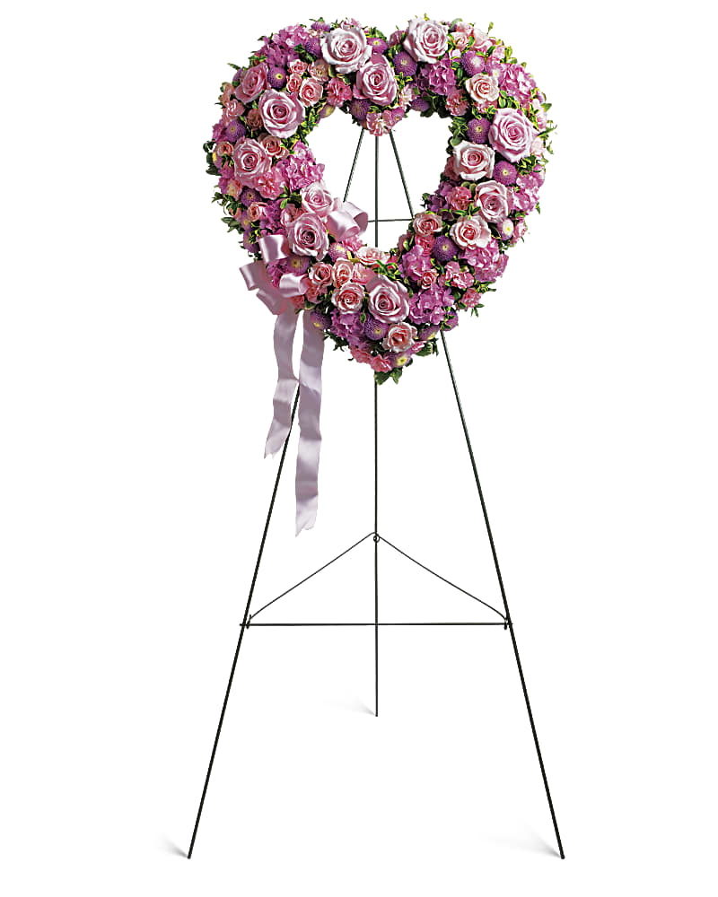 In the shape of a heart, and accented with a pink satin ribbon, this garden of delicate blooms is a tender and classic tribute to a precious life, and a cherished expression of love and sympathy.