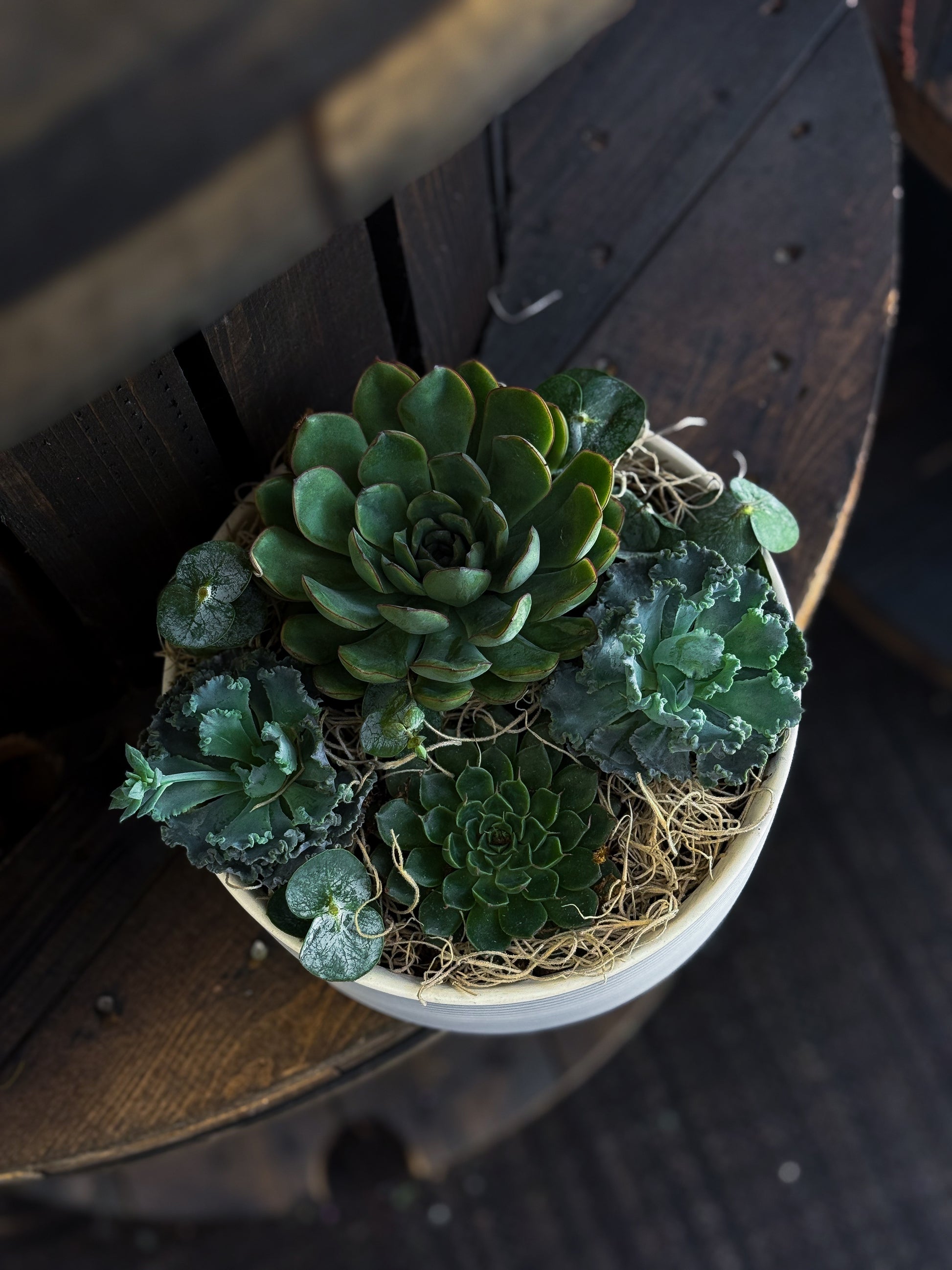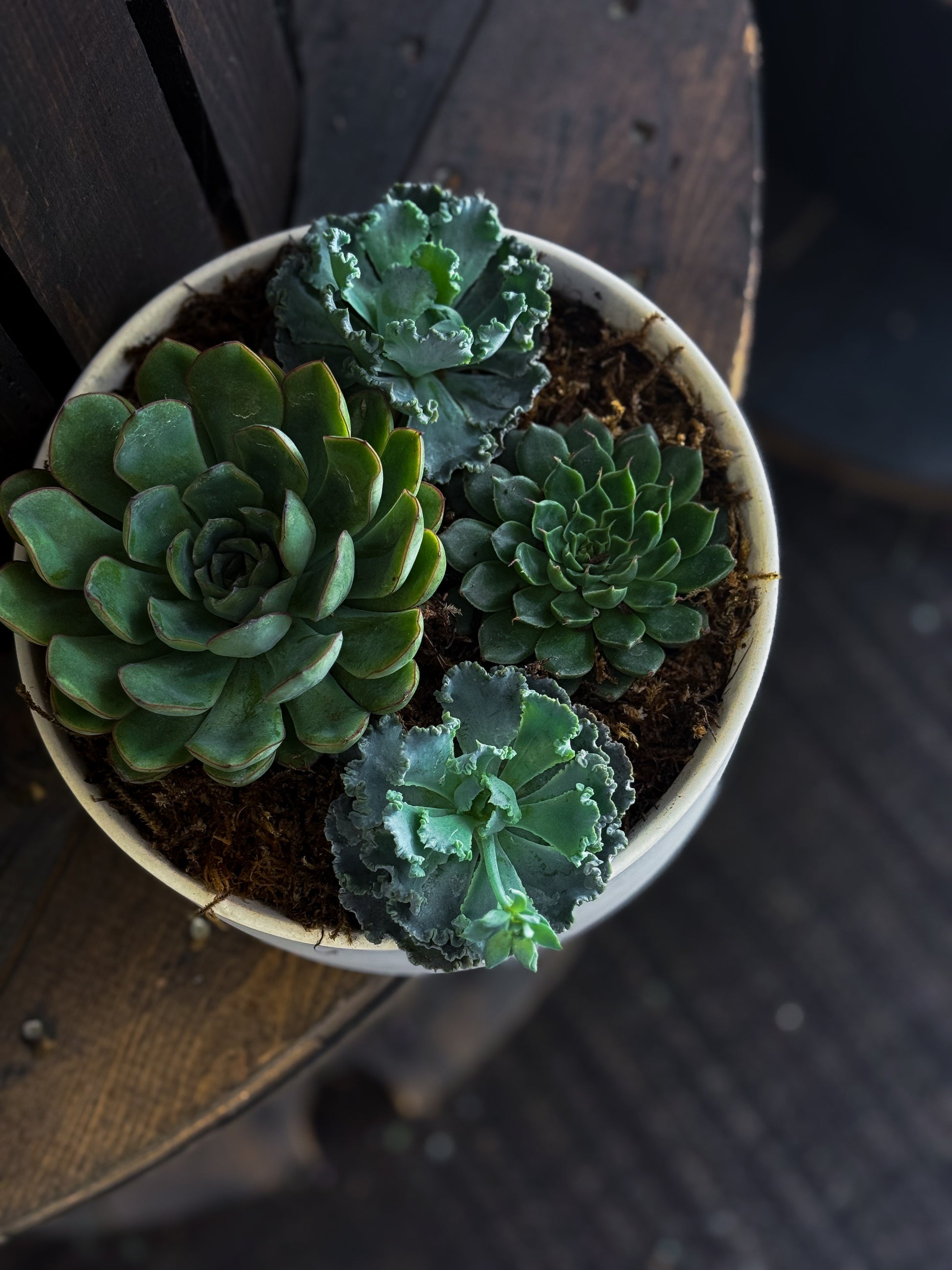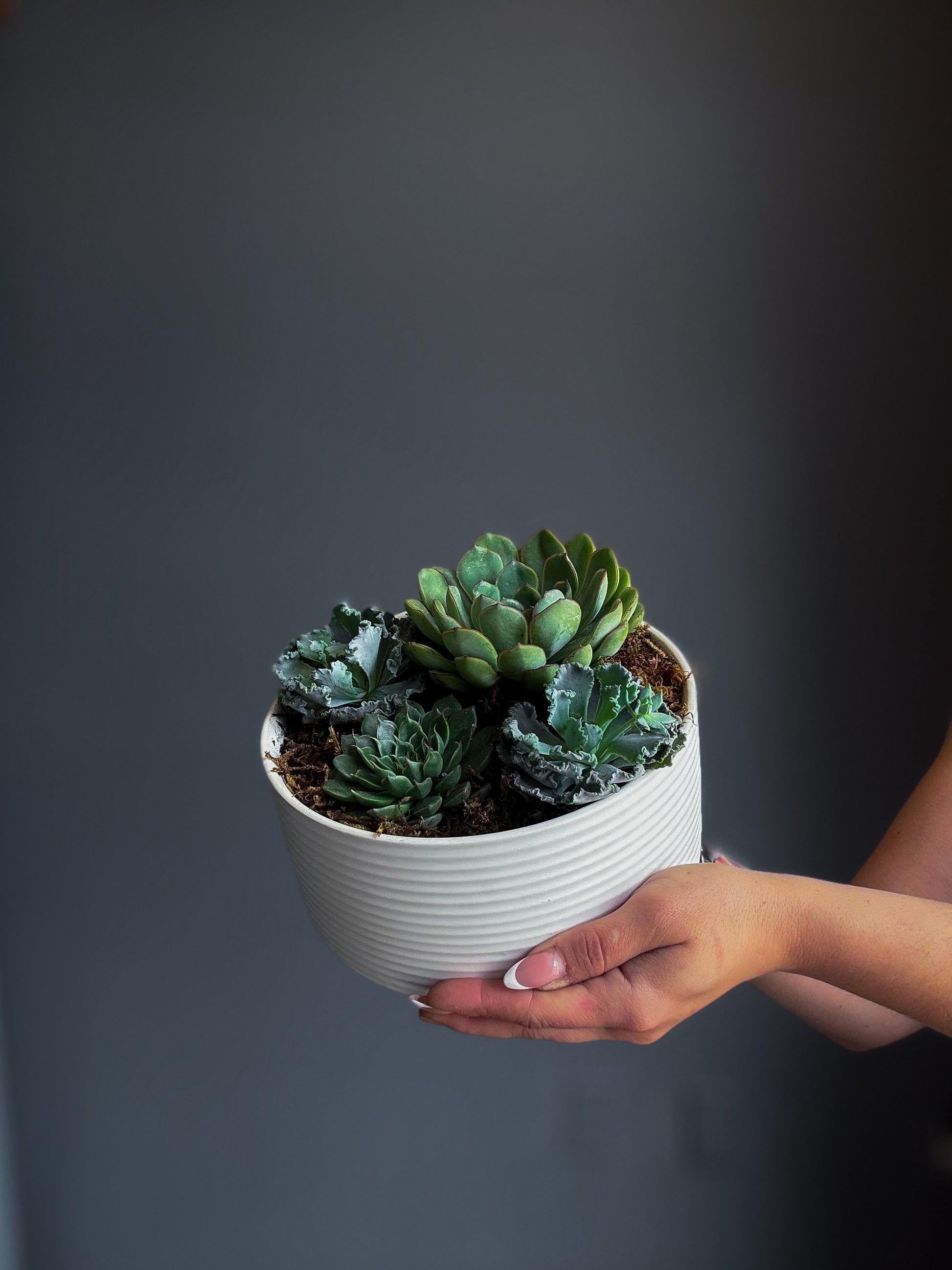 A hand-picked mix of charming succulents in one pot! This low-maintenance arrangement combines textures and tones to create a mini desert garden — perfect for desks, windowsills, or gifts.