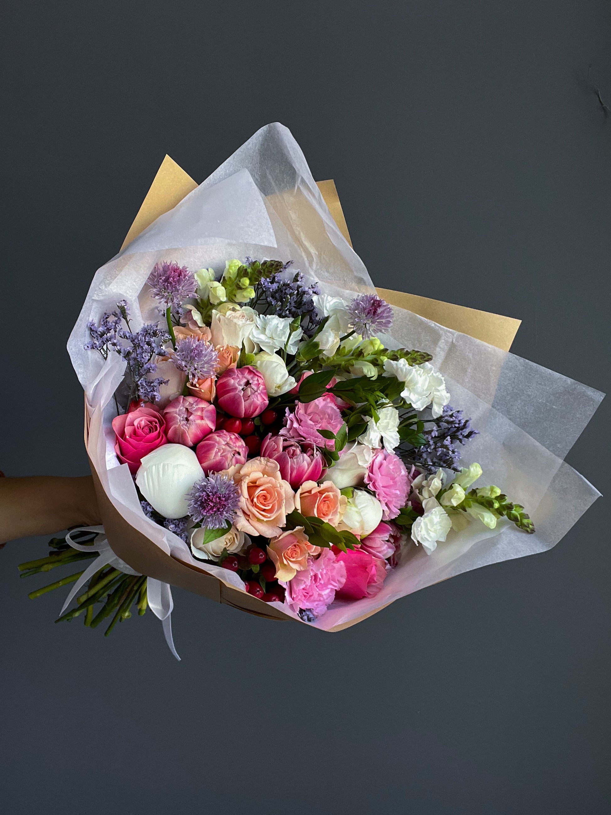 This bouquet features roses mix, mums, tulip, peonies, snapdragon, eucalyptus, greenery, wrapping.