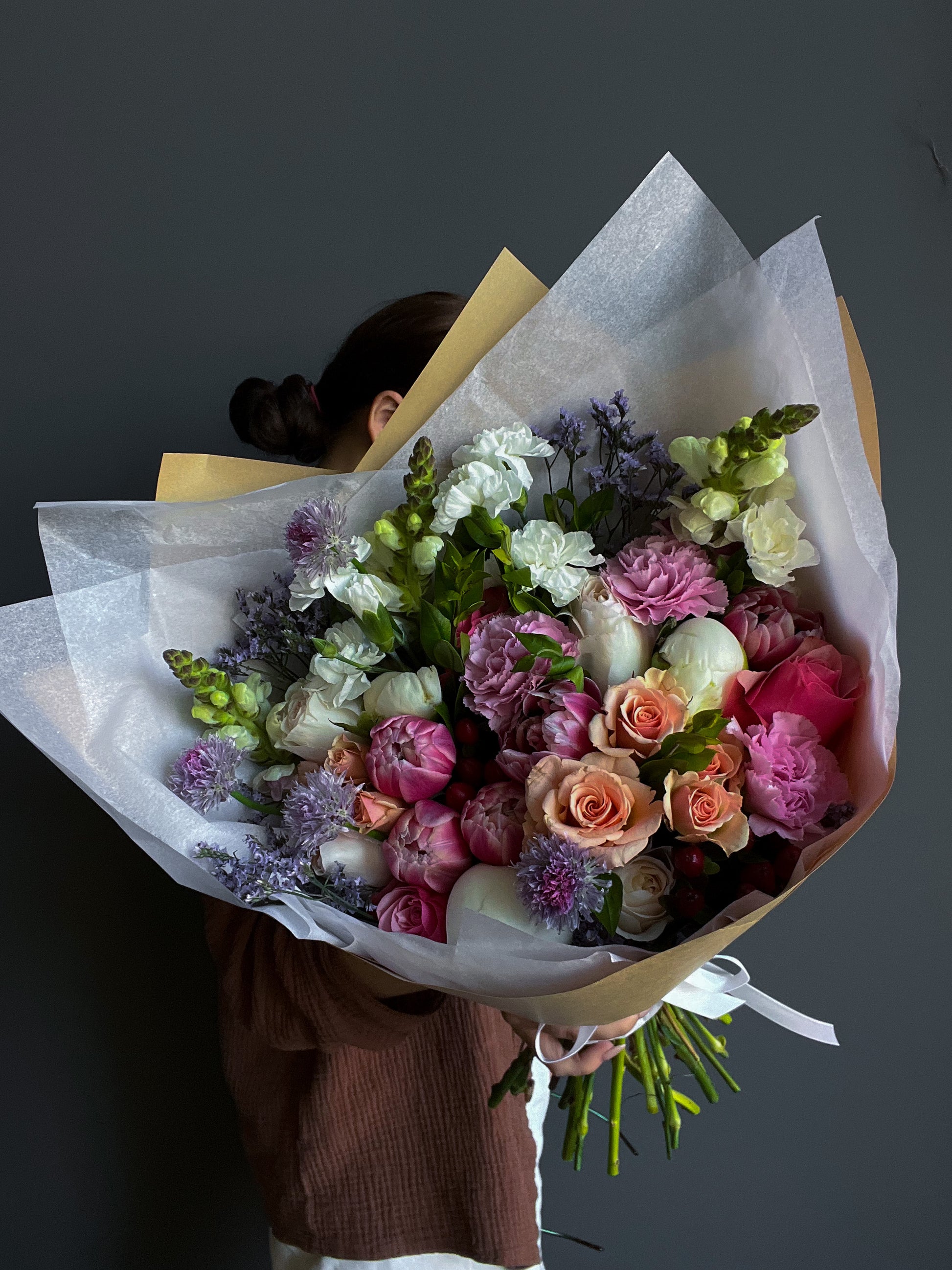We work only with fresh, seasonal flowers. Sometimes blooms arrive in tight buds to ensure longer vase life — this can slightly affect the volume at first. But our florists always add extra elements to make your bouquet as wide and full as possible.