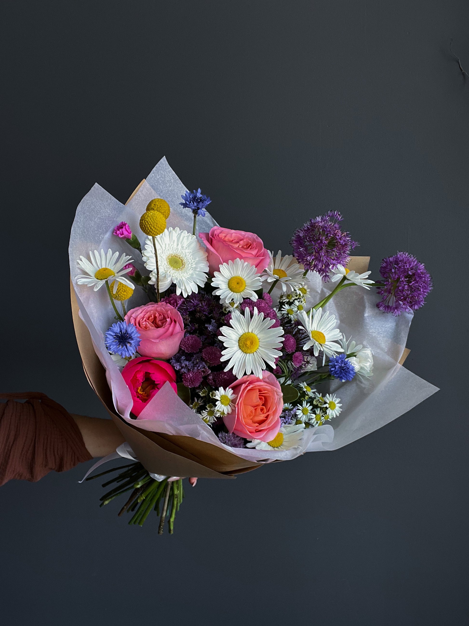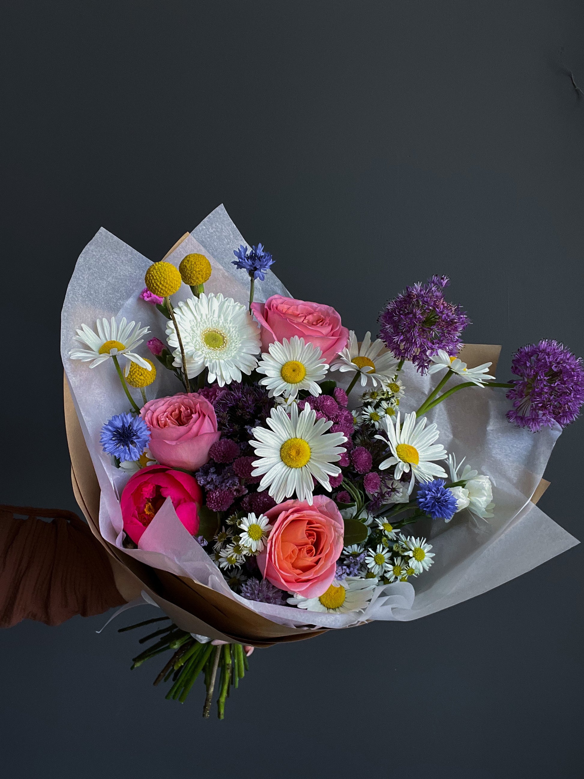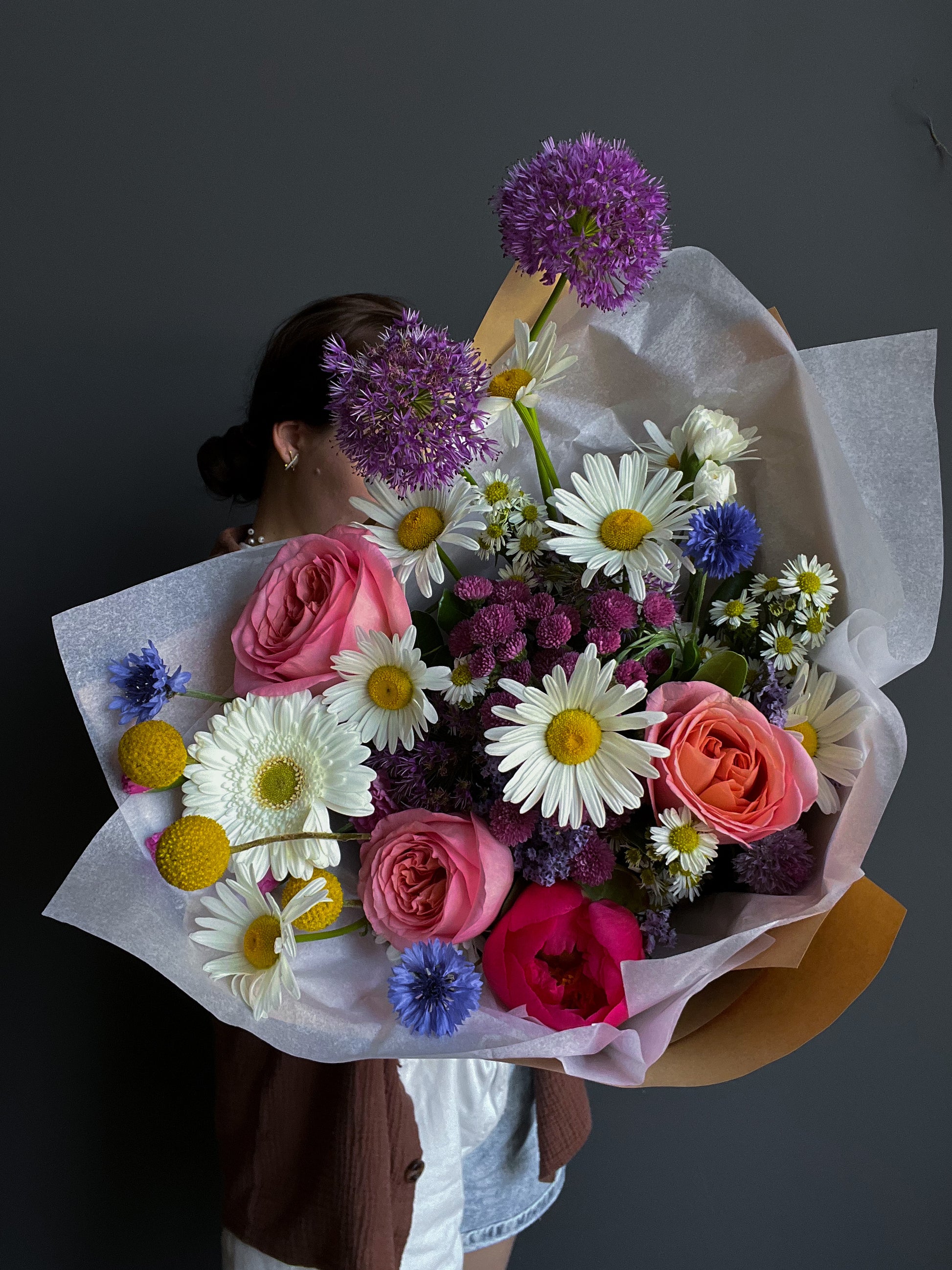This bouquet features roses mix, mums, eucalyptus, greenery, camomiles, allium, matricaria, wrapping.