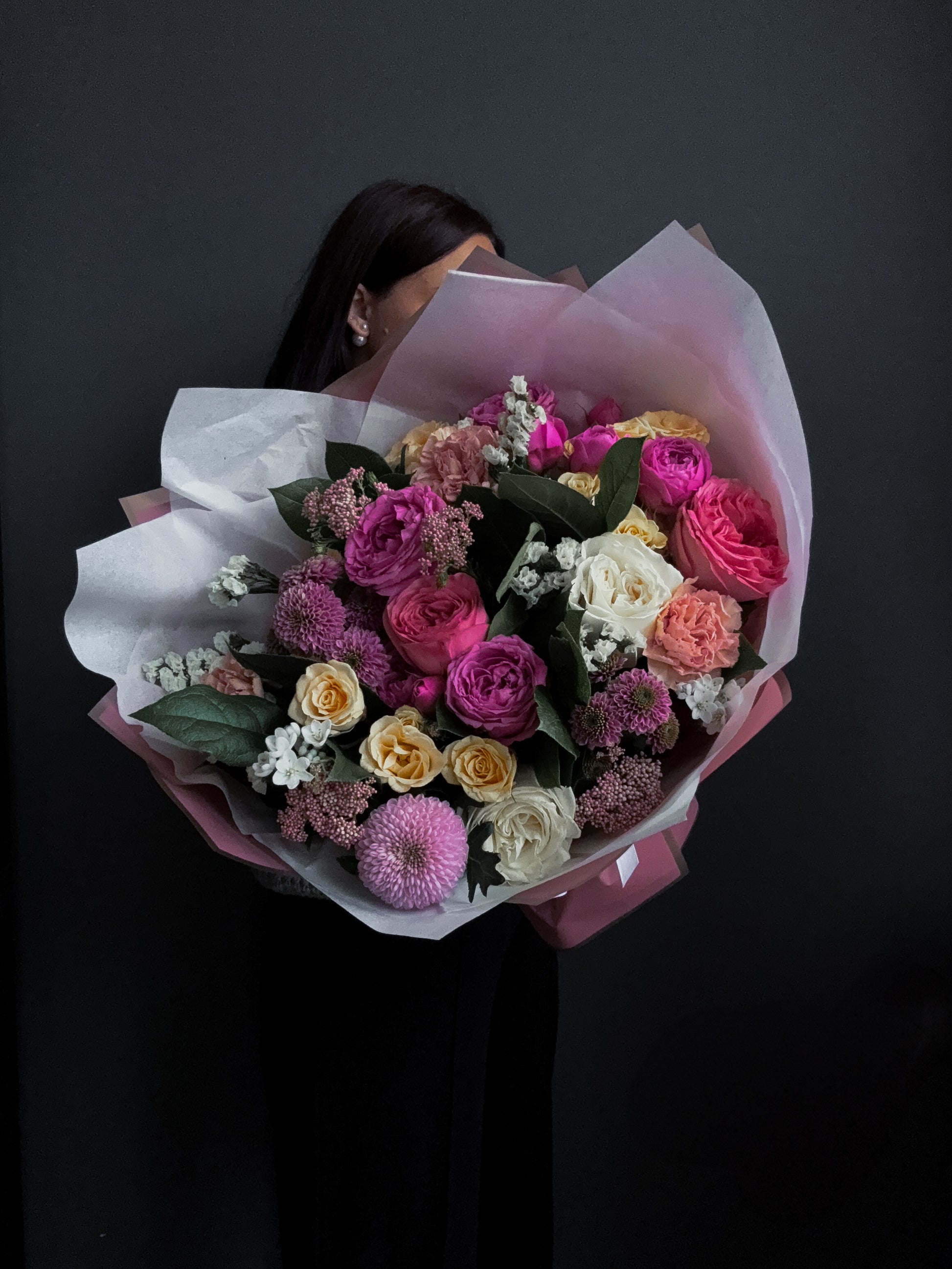 We work only with fresh, seasonal flowers. Sometimes blooms arrive in tight buds to ensure longer vase life — this can slightly affect the volume at first. But our florists always add extra elements to make your bouquet as wide and full as possible.