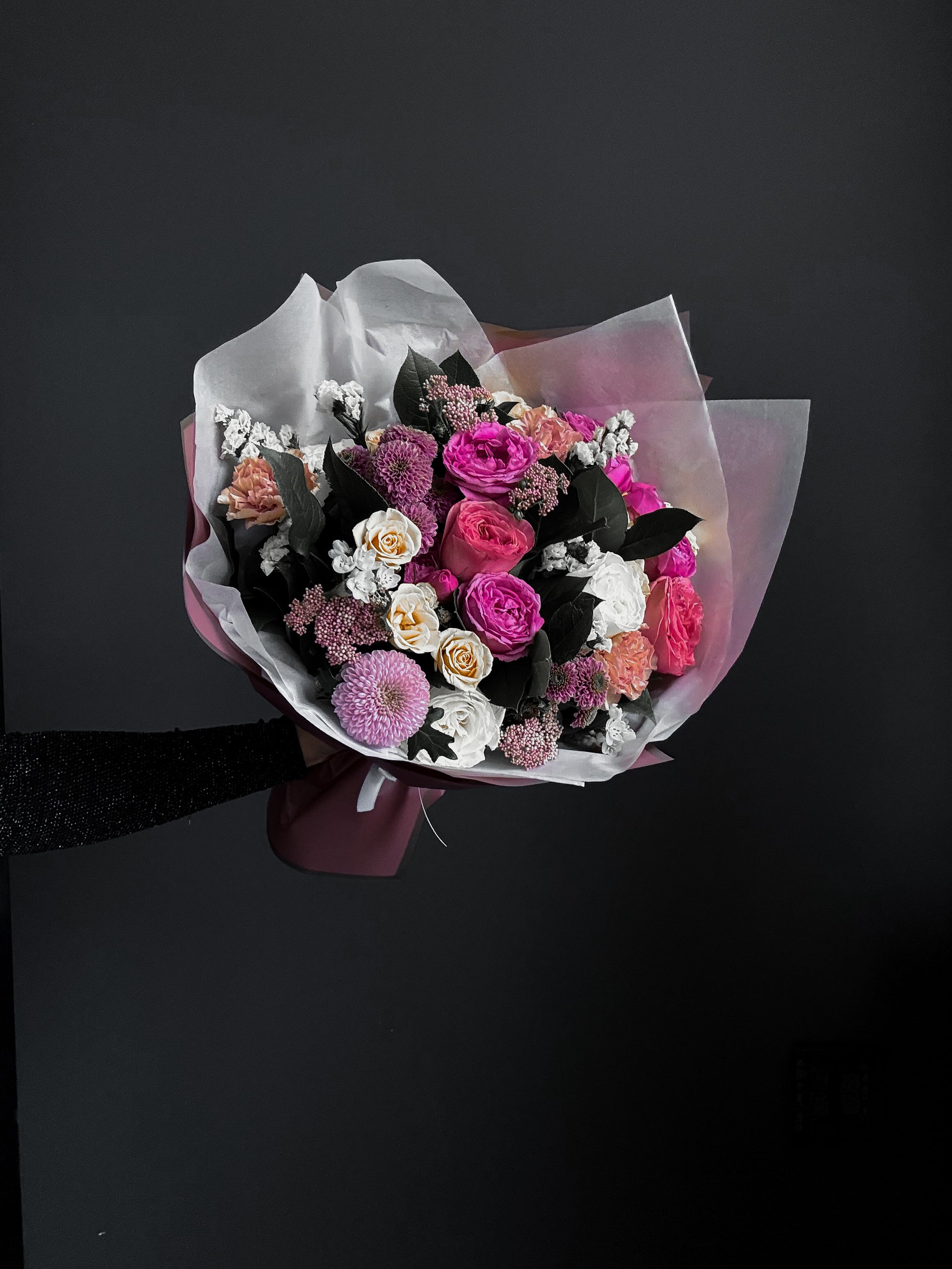 Each bouquet is designed with fresh flowers sourced daily — roses, spray roses, limonium, chrysanthemums, and other seasonal favorites. The exact mix may vary slightly depending on availability, but the look and color palette always stay true to the photo.